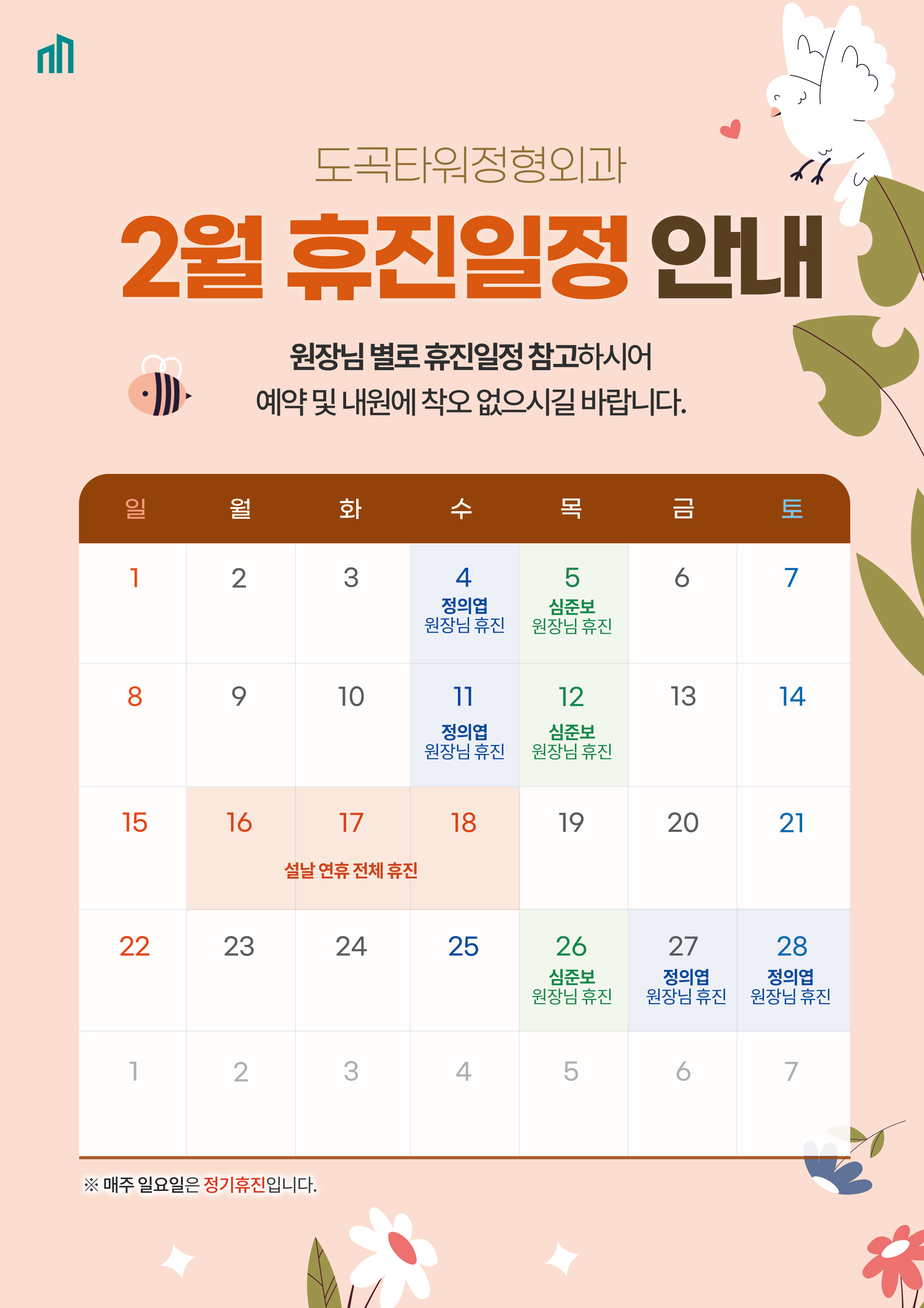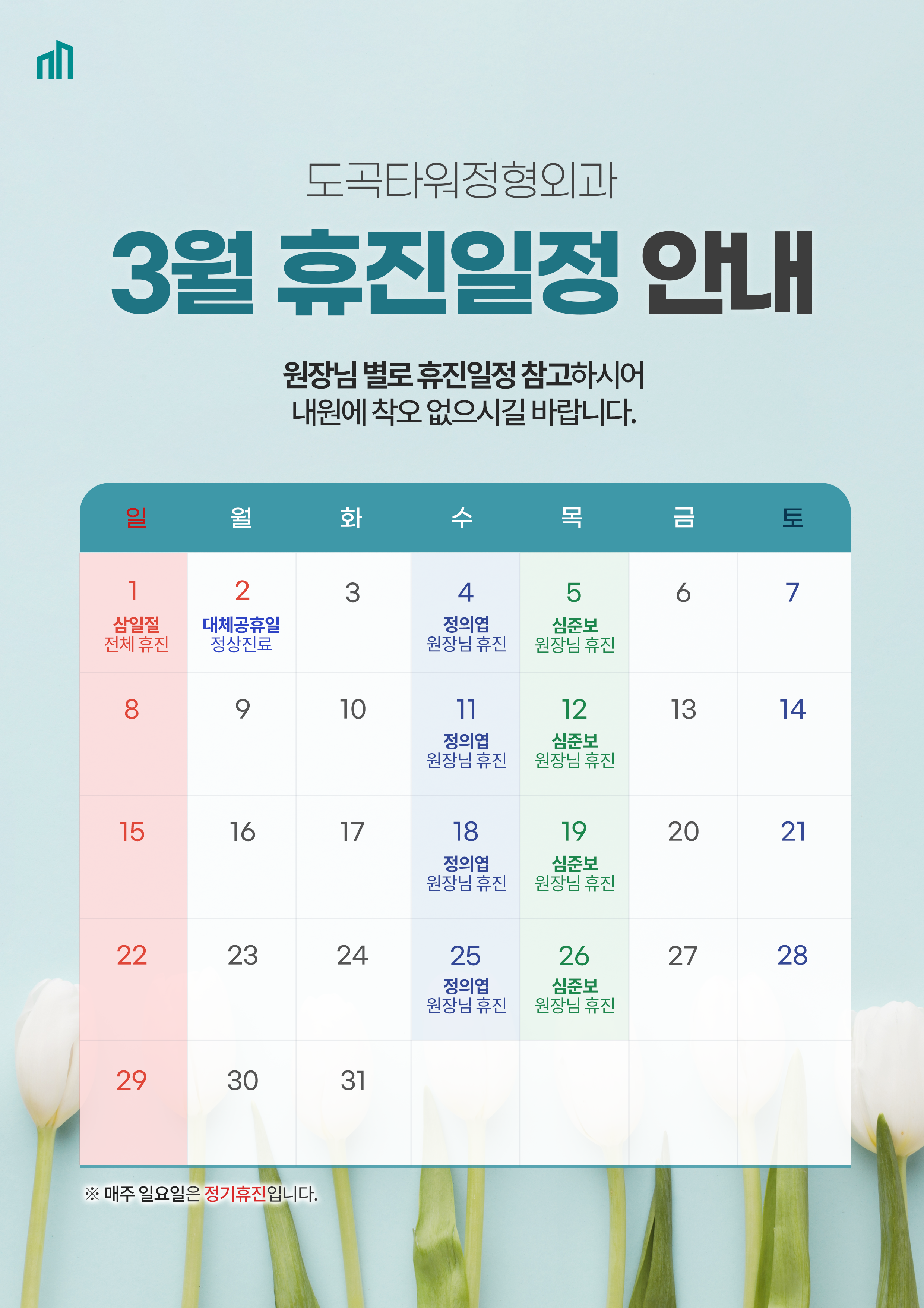 점심시간 오후 01:00 ~ 오후 02:00 (토요일은 점심시간 없이 진료합니다.)